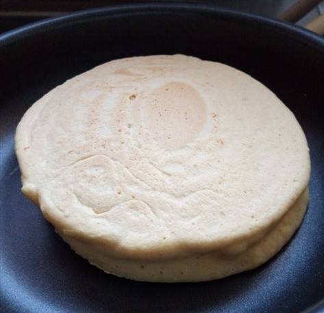 玉子のサイズと水の量でパンケーキの粘り気(厚み)を調節することになります。玉子と水を合わせて玄米粉と同じグラム数になるぐらいがちょうどよいです。